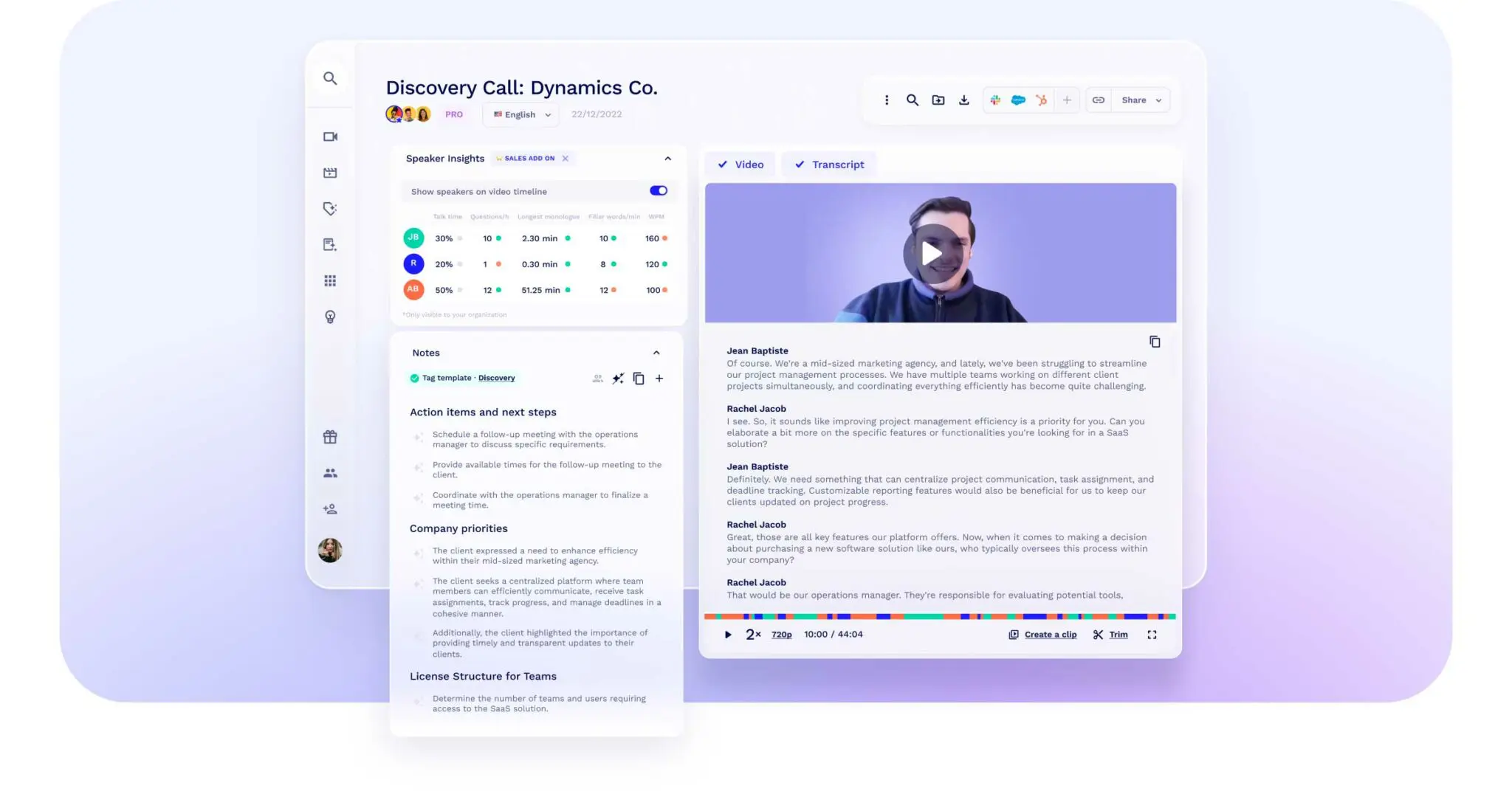 - Clipping and reels: Highlight segments, build reels, push timestamps into Slack, HubSpot, Salesforce, Notion, Google Docs, etc.