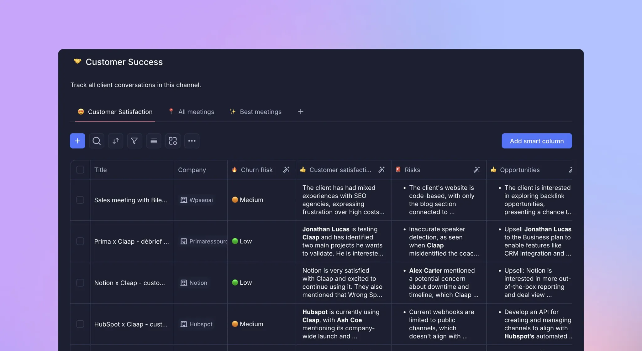 Customizable for your sales process. Unlike Tl;dv's rigid templates, Claap adapts to MEDDIC, BANT, SPICED, or custom frameworks. Smart Tables analyze multiple calls at once to spot patterns.