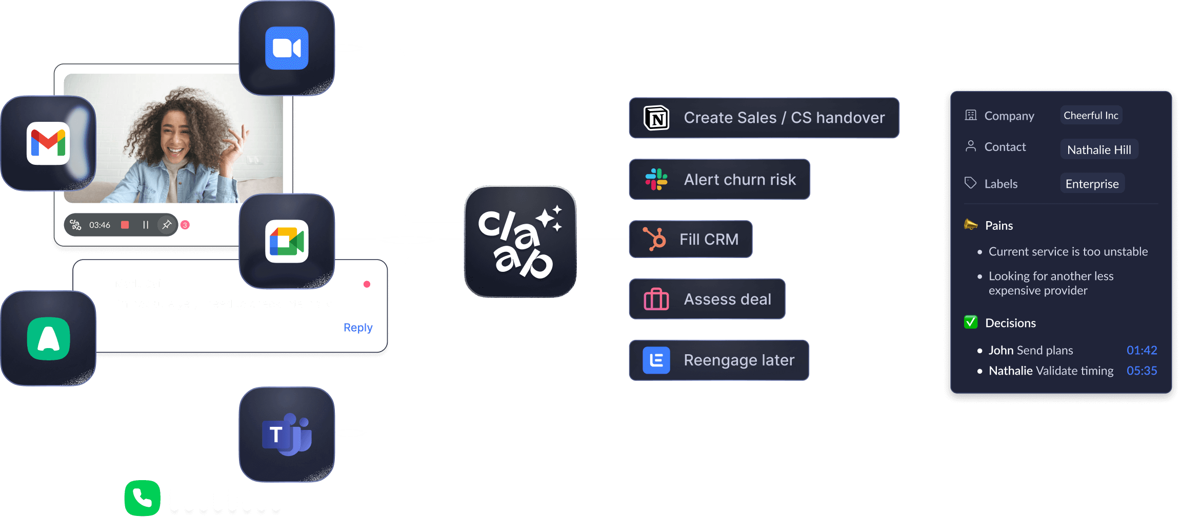 Claap is ideal for teams relying on conference and phone calls, as well as field sales teams needing a streamlined way to capture and share insights on the go.