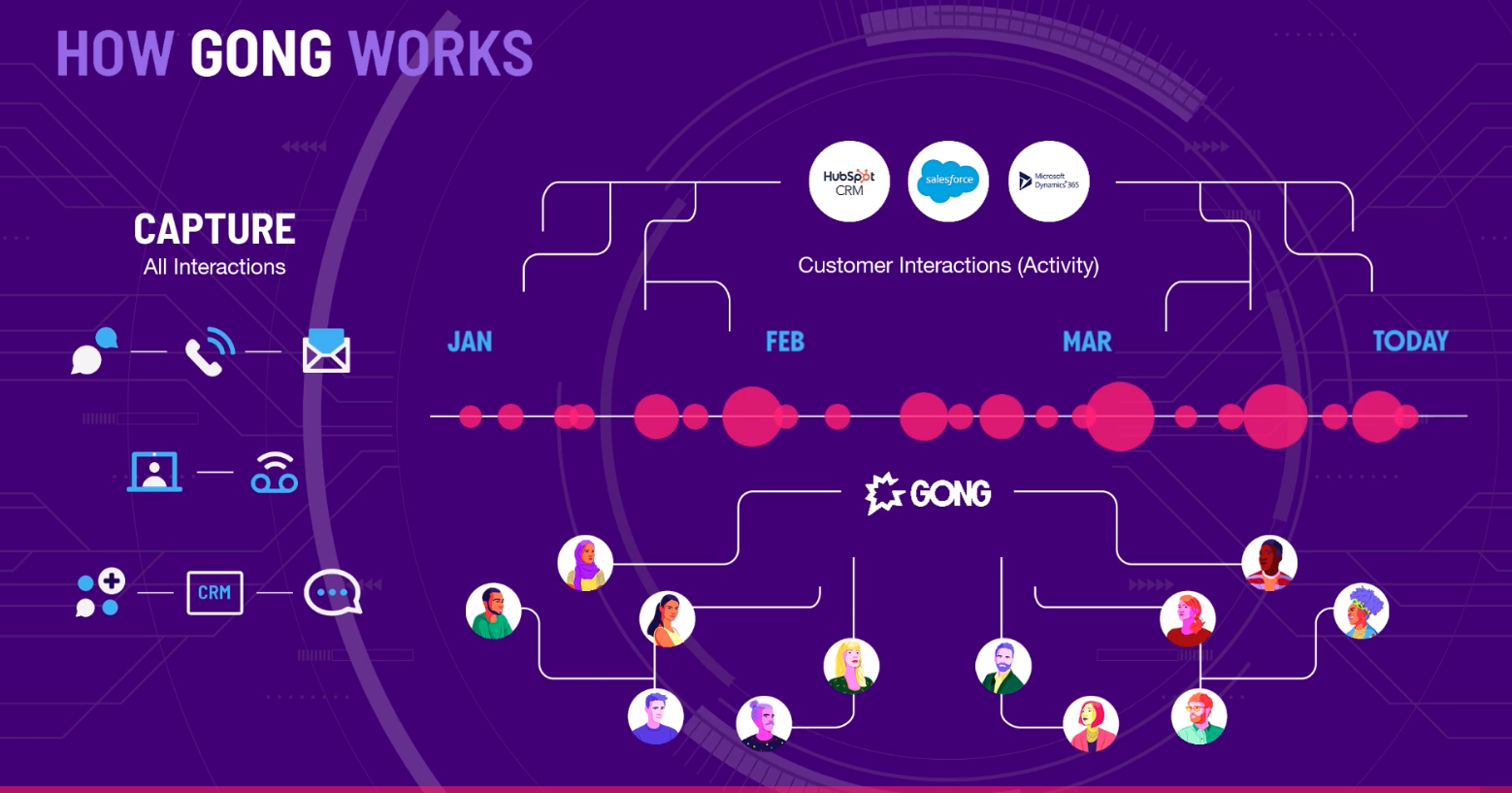 Gong captures and analyzes what's actually said in customer conversations, then feeds those insights back into your CRM. It's a layer on top of your CRM that populates it with reality, not just rep opinions.