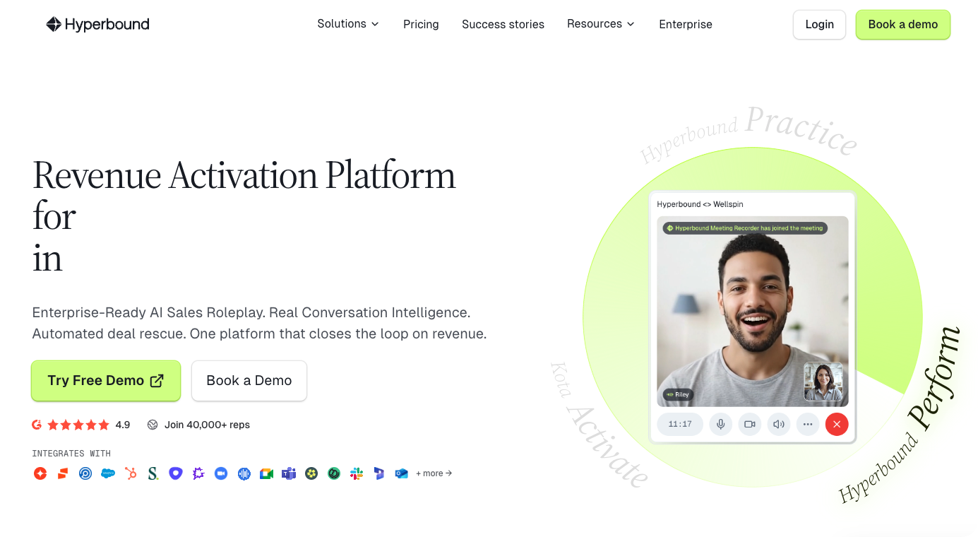 Hyperbound specializes in simulation. It ingests the real calls of your top performers to create dynamic, high-fidelity AI roleplays. This allows new hires to practice against actual buyer personas and complex objections before they ever speak to a live prospect, significantly increasing onboarding speed and confidence.
