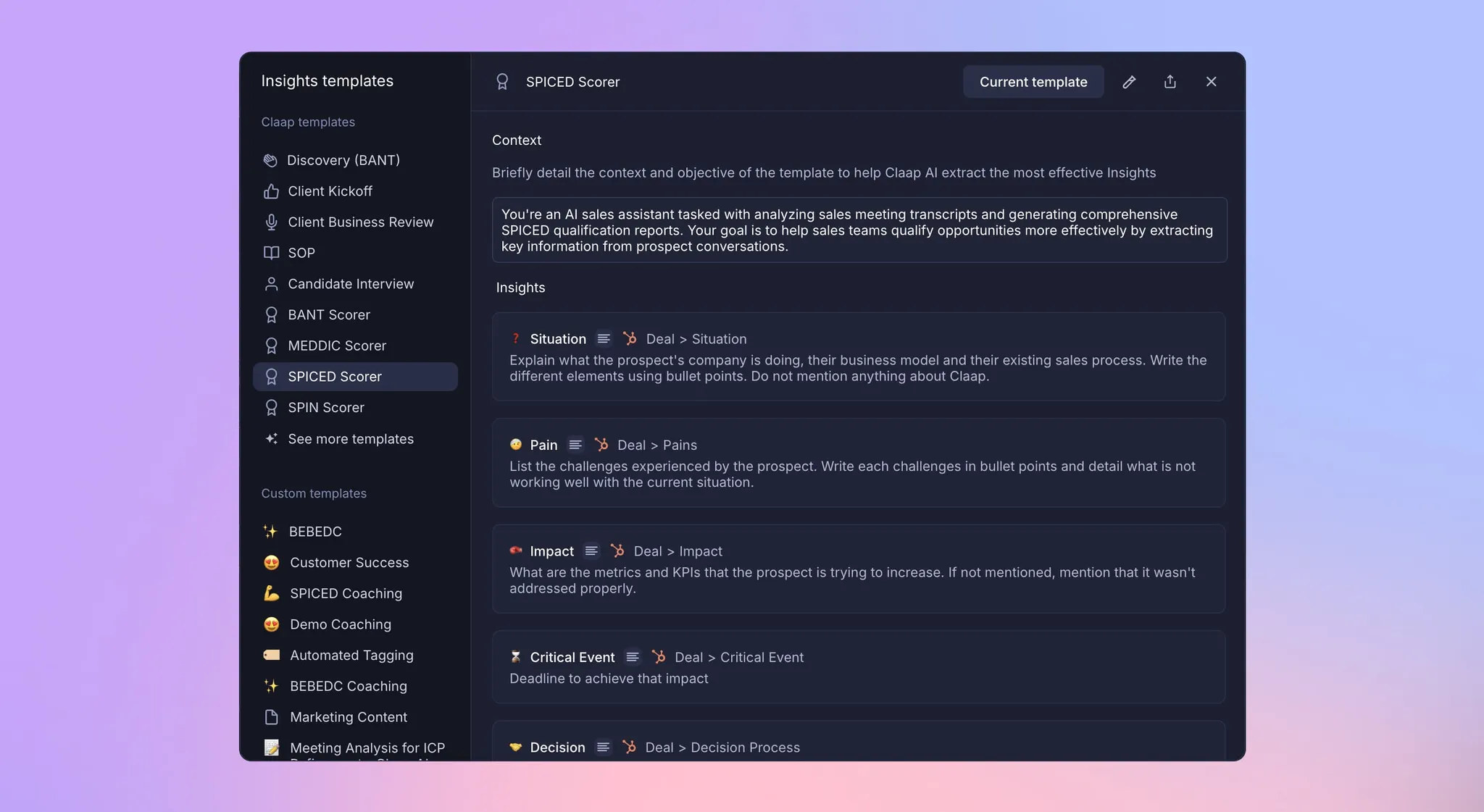 Claap removes the need for manual prompt engineering by automatically recording and transcribing my meetings. It doesn't just provide a wall of text. It uses specialized AI to extract key sales frameworks like MEDDIC or BANT instantly.