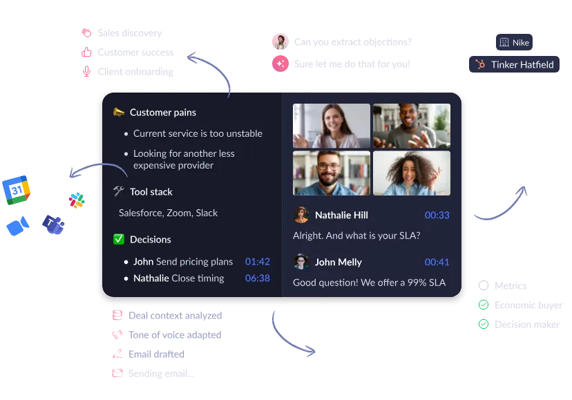 - Conversation data analysis — e.g. talk ratios, objection frequency, next-step clarity.