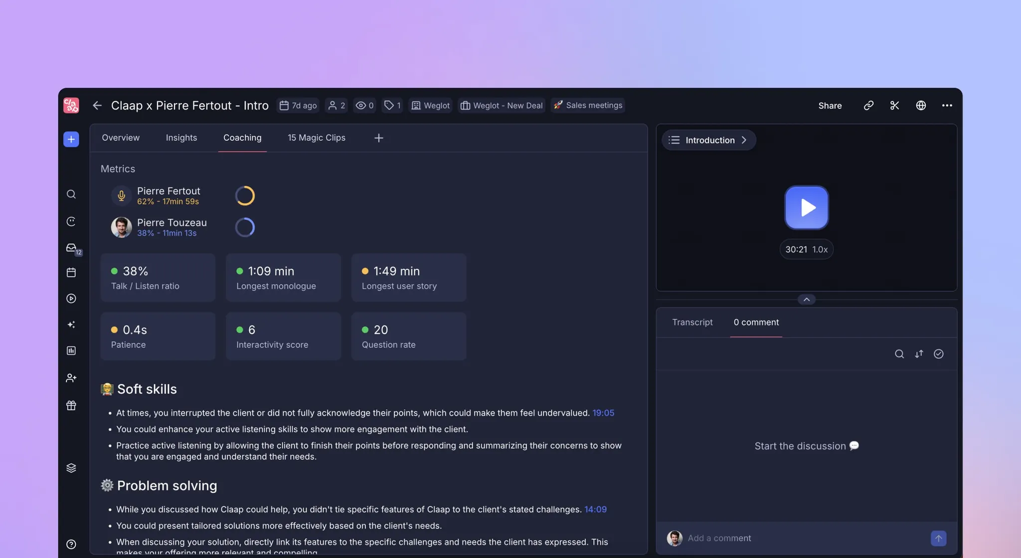 💡 Conversation Intelligence tools like Claap let leaders compare top vs. average reps’ talk tracks, making it easy to refine positioning, messaging, and tactics with evidence instead of assumptions.
