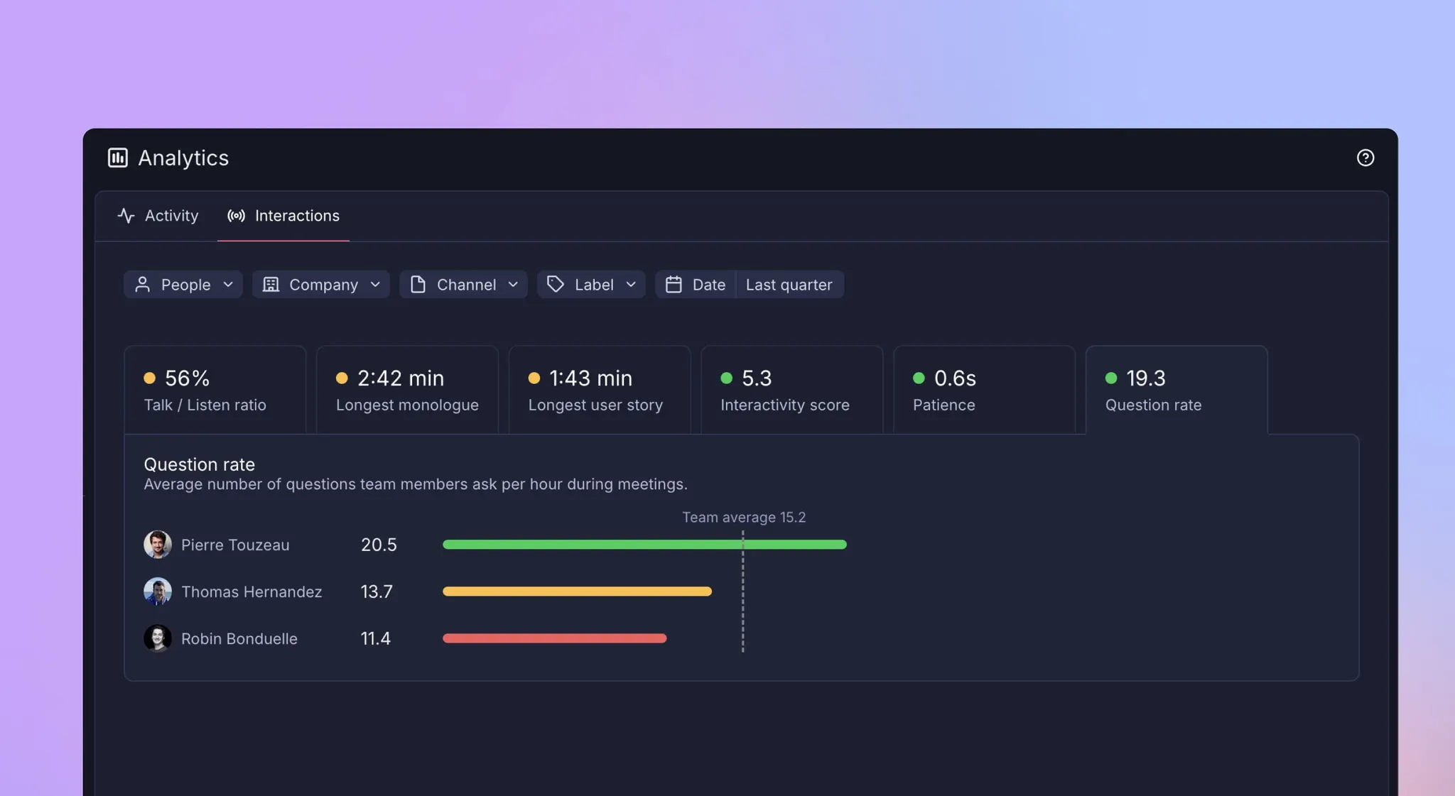 - Conversation quality: Measured through talk-to-listen ratios and question depth. Conversation intelligence allows you to coach specific skills instead of reviewing generic activity.