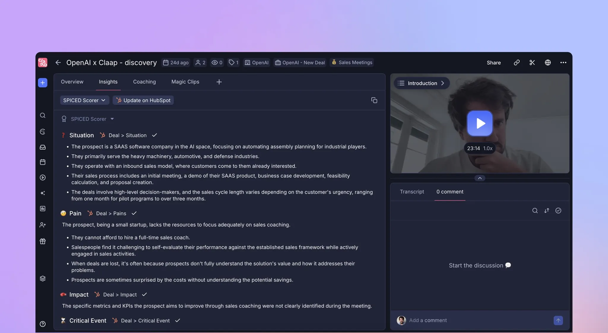Claap records, transcribes, and summarizes sales calls so reps can focus on the conversation instead of the keyboard. It’s built to reduce manual work, enrich CRM data automatically, and give leaders actionable insights from every conversation.