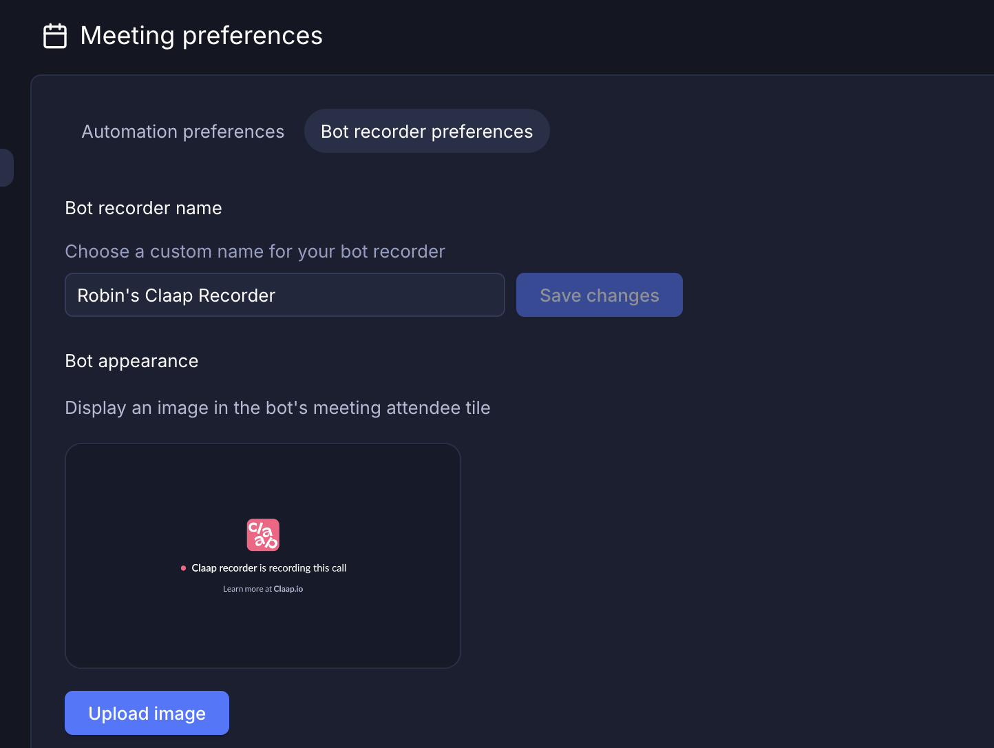 Custom bot background image (Business). Replace the default Claap bot tile with your own logo or a discreet image in client-facing meetings. Configure it in Meeting preferences > Bot recorder preferences.