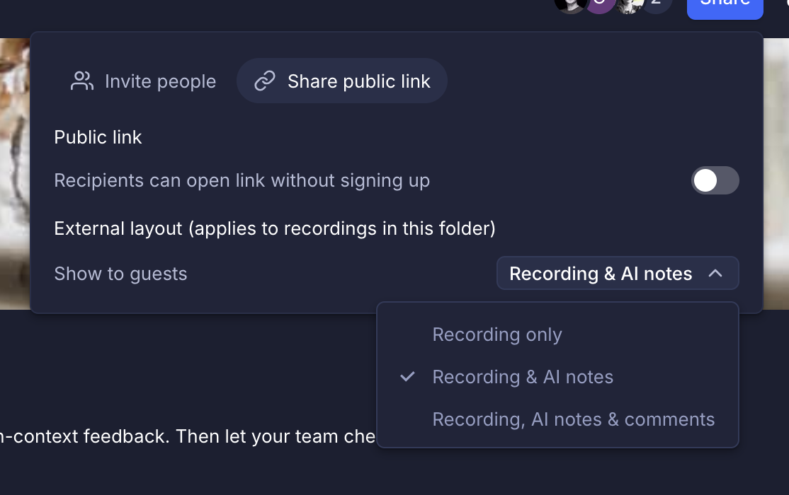 Personalized public link layouts. When you share a Claap externally, decide exactly what guests and public viewers see. Three options: video only, video + transcript, or video + AI summary. Perfect for prospect demos, client recaps, or any time you want a clean, branded share without exposing internal context.