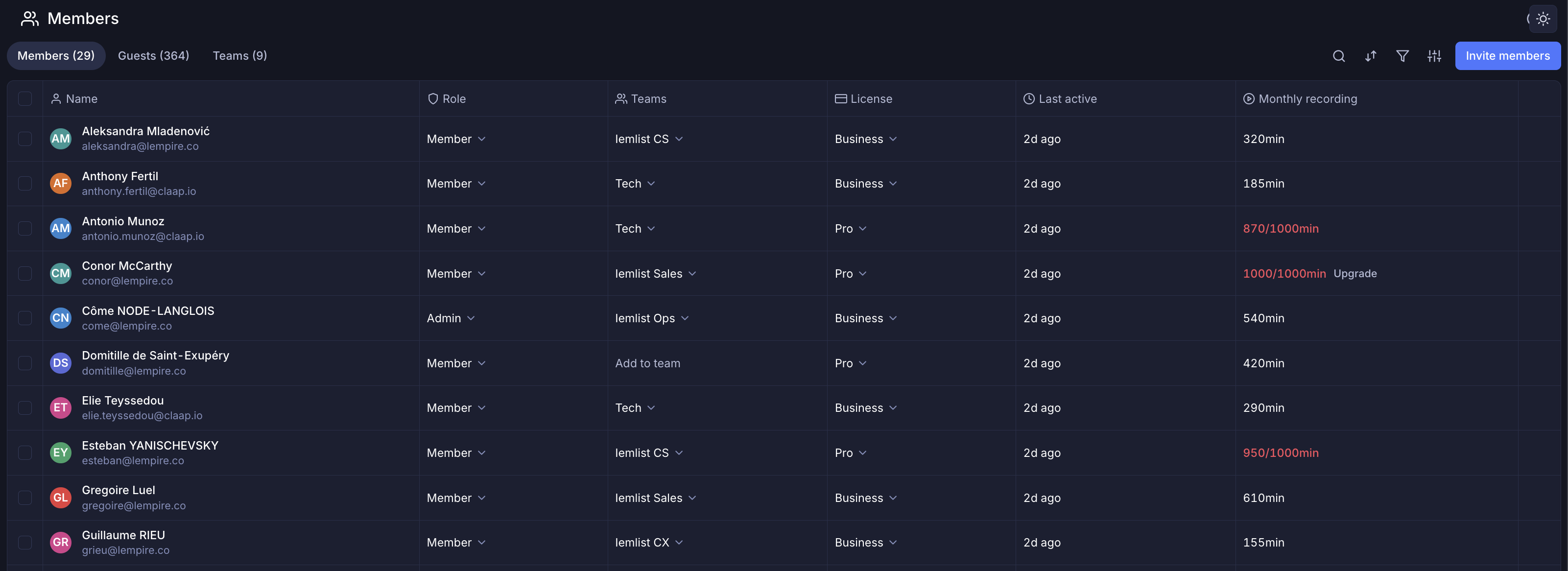 The Members page has been fully rebuilt. Admins can now see exactly how many minutes each teammate has recorded this month, manage Pro plan usage, and stay on top of seat allocation, all from one screen.